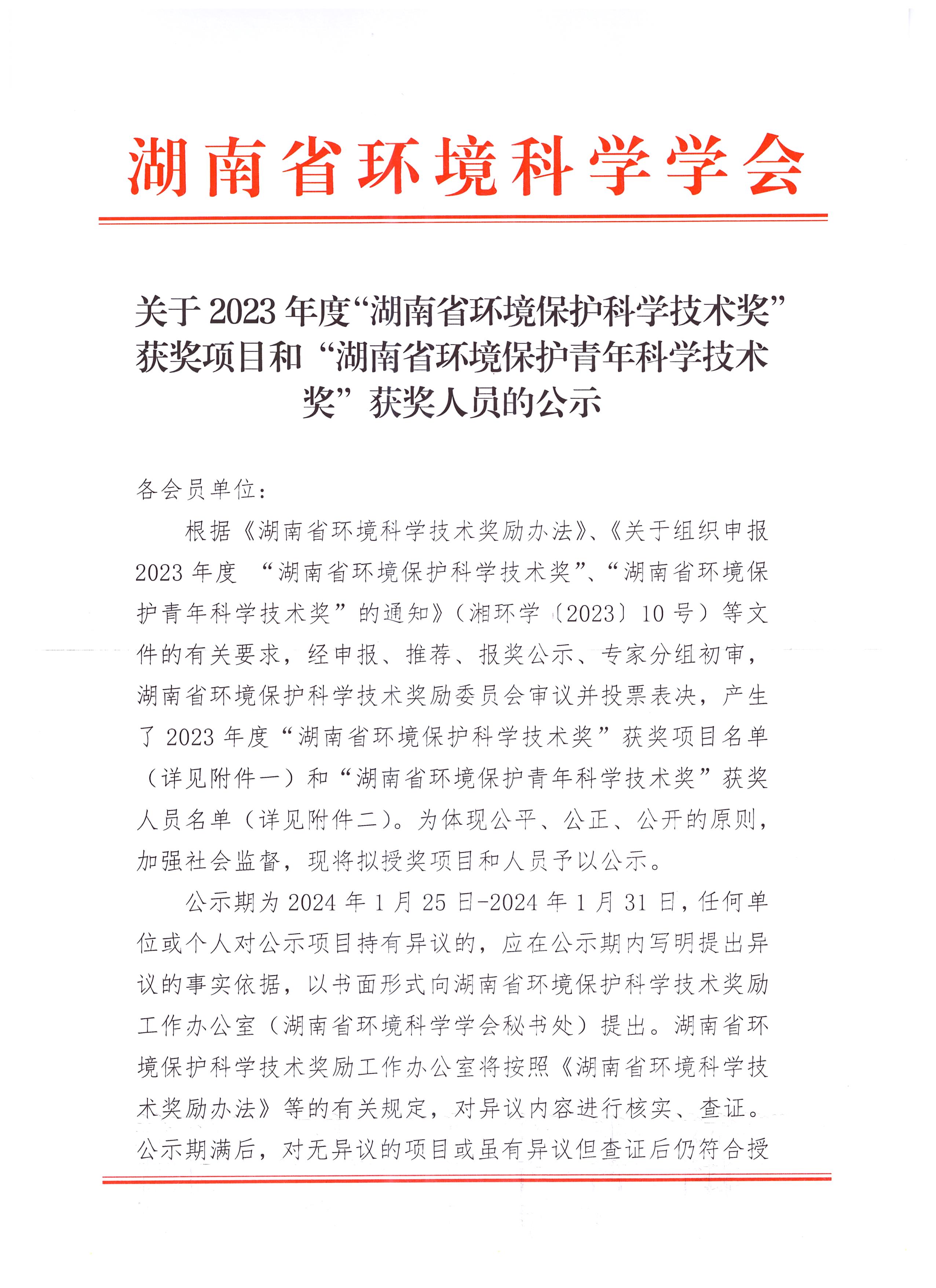 2023年度“湖南省环境保护青年科学技术奖”获奖人员公示